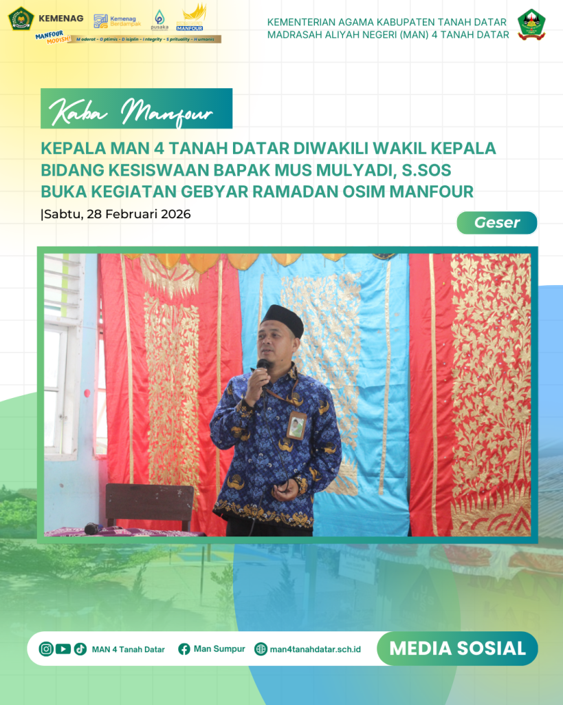 Sumpur- Sabtu, (28/2/26) Kepala MAN 4 Tanah Datar yang diwakili oleh Wakil Kepala Bidang Kesiswaan, Bapak Mus Mulyadi, S.Sos, secara resmi membuka kegiatan Gebyar Ramadan OSIM Manfour yang dilaksanakan selama dua hari, Kamis hingga Jumat, 26–27 Maret 2026. Kegiatan ini berlangsung meriah dengan diikuti oleh para siswa-siswi yang penuh antusias dalam menyemarakkan bulan suci Ramadan.