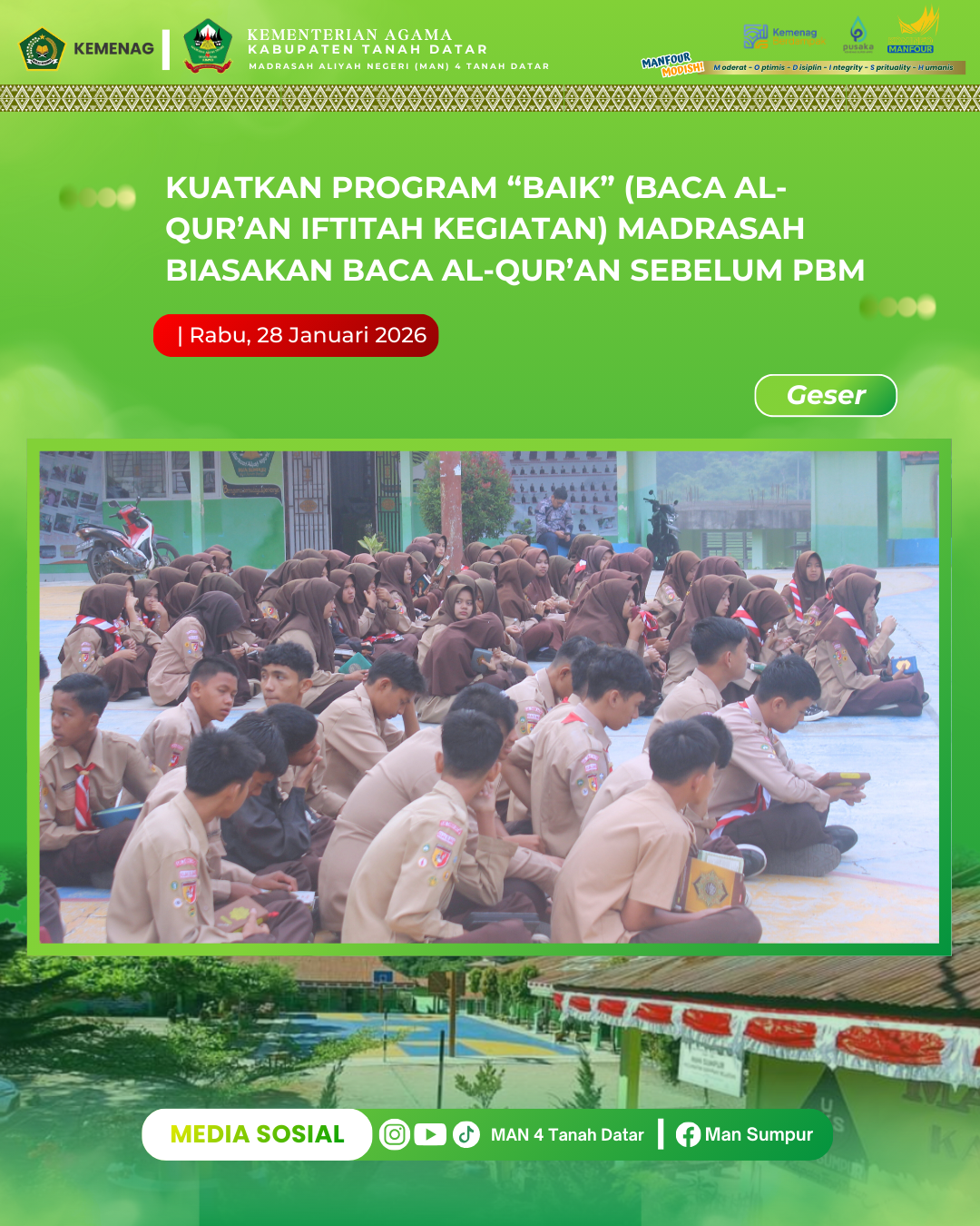 Kuatkan Program “BAIK”, Madrasah Biasakan Baca Al-Qur’an Sebelum PBM Sumpur- Rabu, (28/01/26) Dalam upaya menanamkan nilai-nilai keislaman serta membangun karakter