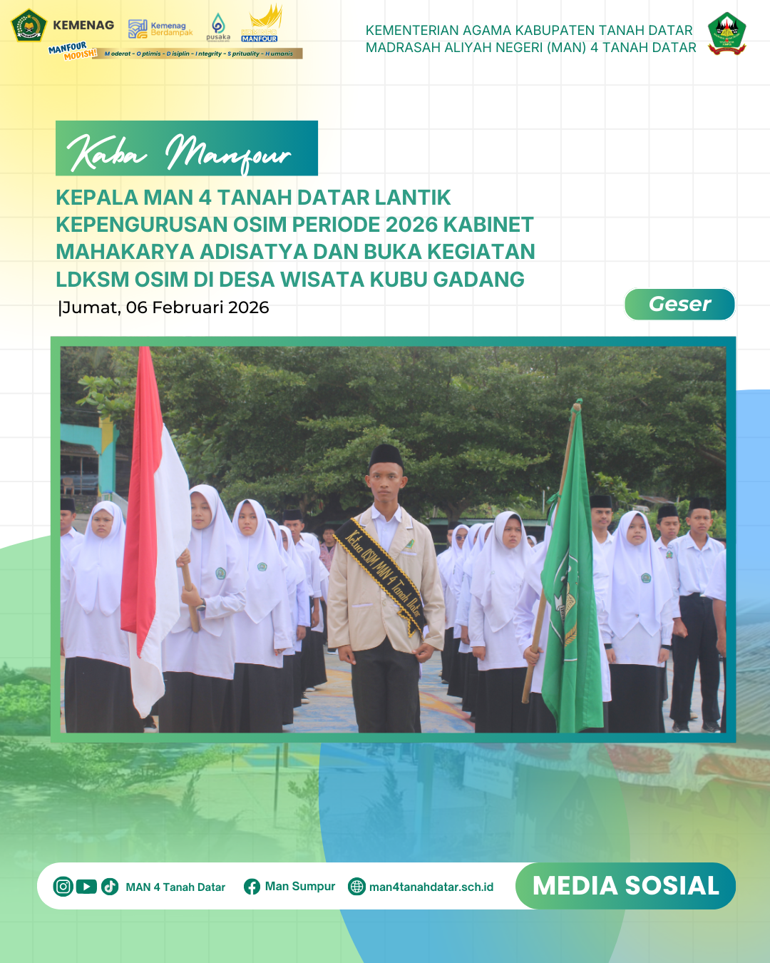 KEPALA MAN 4 TANAH DATAR LANTIK KEPENGURUSAN OSIM PERIODE 2026 KABINET MAHAKARYA ADISATYA DAN BUKA KEGIATAN LDKSM OSIM DI DESA WISATA KUBU GADANG PADANG PANJANG